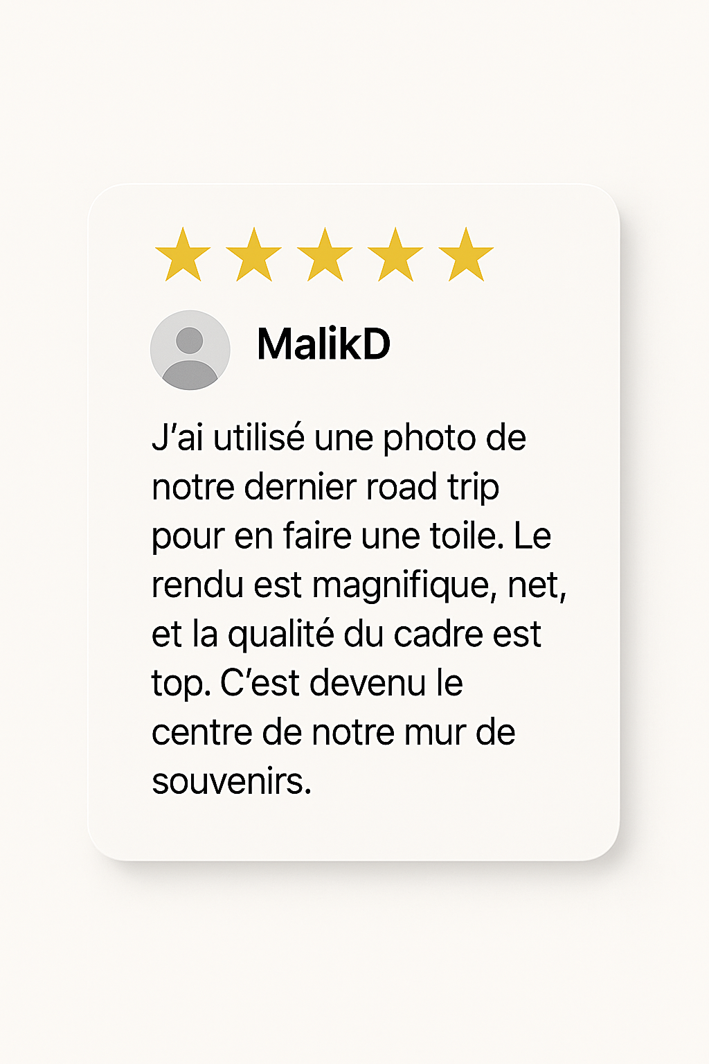 Que ce soit pour offrir un cadeau original, immortaliser un moment précieux ou tout simplement embellir votre intérieur, nous vous accompagnons à chaque étape pour donner vie à vos envies. Notre interface intuitive permet de créer facilement un produit unique, sans compétence technique, depuis un ordinateur ou un smartphone.